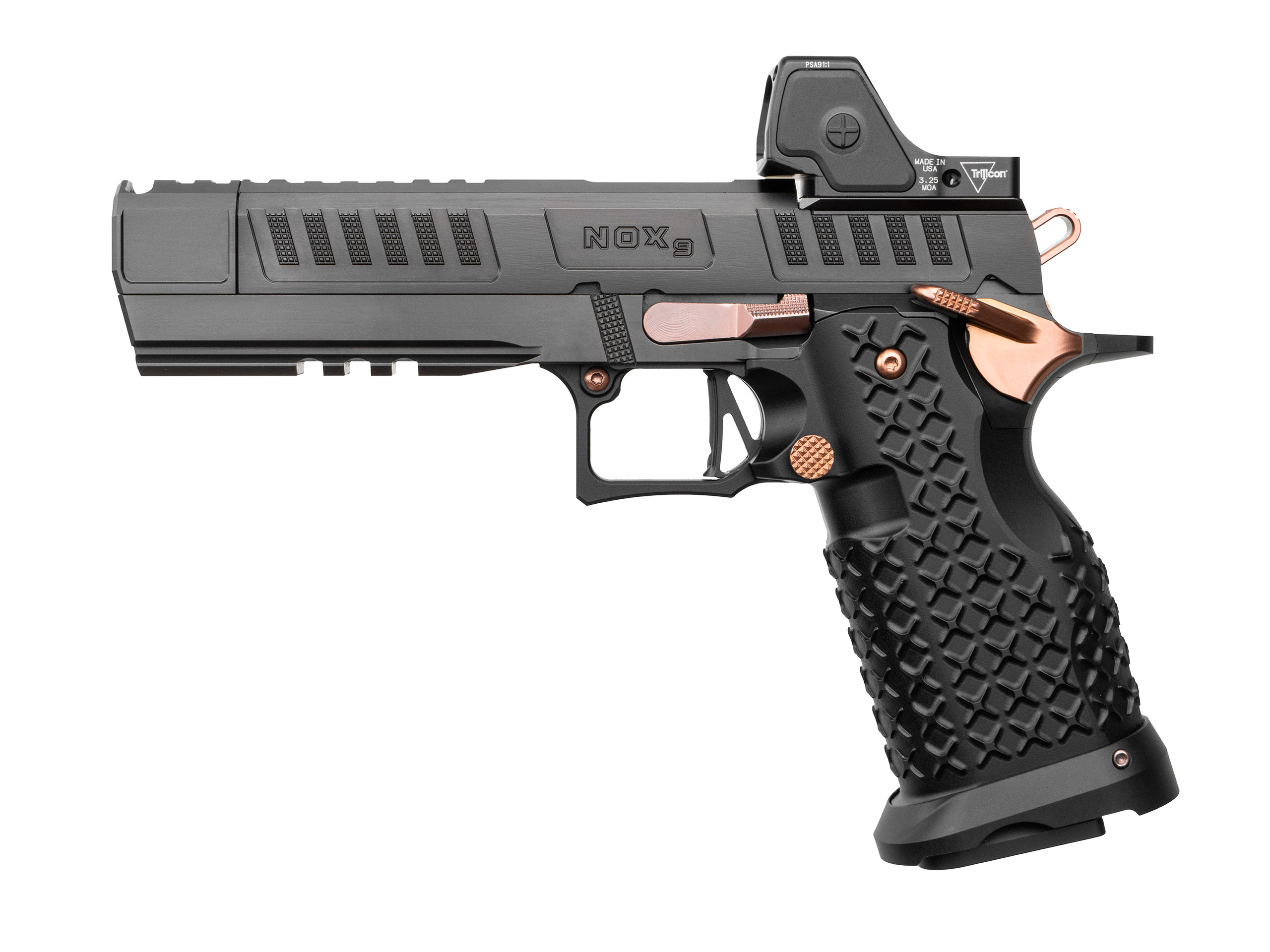 - Armored Billet – The Nox 9 Features armored billet, safety, slide stop, magazine release, hammer, and sear. All constructed from tool steel and PVD coated in Copper Canyon